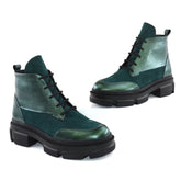 Ghete Dama Din Piele Naturala Ema 2Ghete de dama piele naturala cu siret si fermoar functional la inetrior Confectionate manual din piele naturala exterior Interior captusit cu blanita neagra Piele naturala: box bizon verde + velur verde . Talpa groasa neagra. Inaltime talpa in fata 3 cm, in spate 4.5...