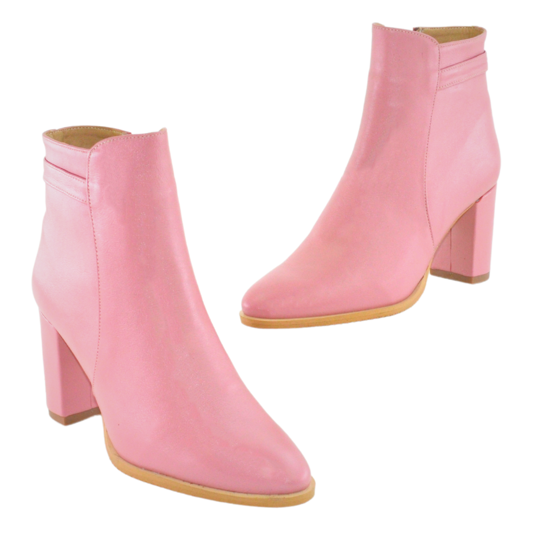 Botine elegante de dama cu toc vopsit Confectionate manual din piele naturala exterior Piele naturala roz. La interior sunt captusite cu blanita Inaltime toc 7 cm. Brantul botinelor este prevazut cu un buret special care ofera un plus de comoditate Botine produse in Romania
