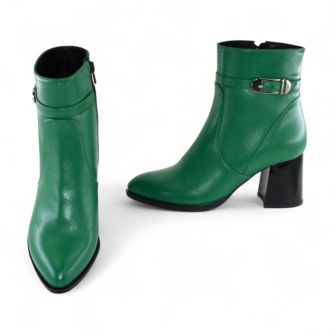 Ghete de dama piele verde cu curea si fermoar functional la inetrior Confectionate manual din piele naturala exterior Interior captusit cu blanita neagra Talpa groasa neagra. Brantul bocancilor este prevazut cu un buret special care ofera un plus de confort
