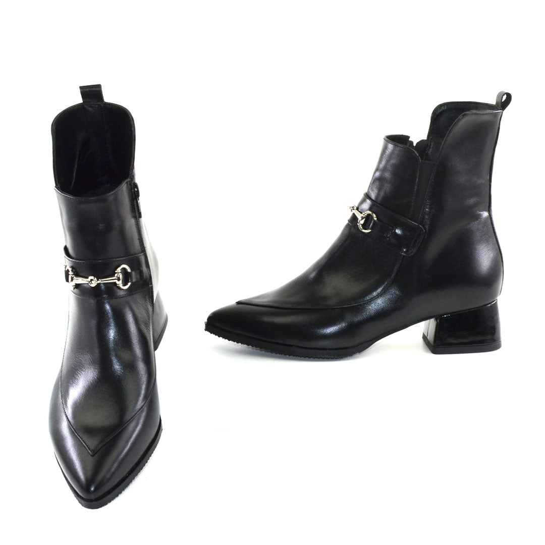 Botine elegante de dama cu toc vopsit Confectionate manual din piele naturala exterior Piele negru + ornament argintiu La interior sunt captusite cu blanita Inaltime toc 3,5 cm Toc imbracat piele cu insertie arginti Brantul botinelor este prevazut cu un buret special care ofera un plus de comoditate Botine produse in Romania