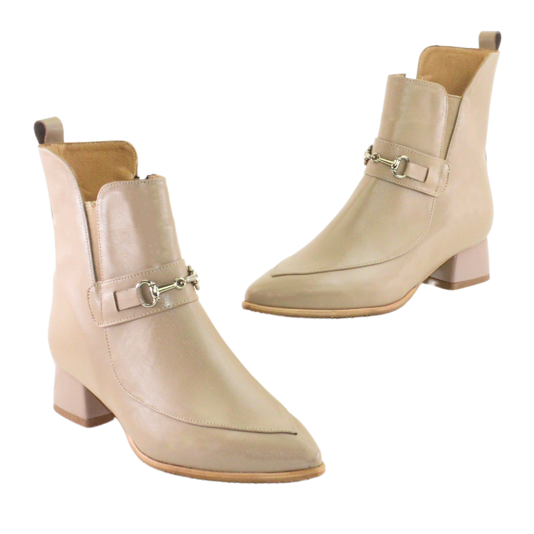 Botine elegante de dama cu toc vopsit Confectionate manual din piele naturala bej exterior + ornament argintiu La interior sunt captusite cu blanita Inaltime toc 3,5 cm Toc imbracat piele cu insertie arginti Brantul botinelor este prevazut cu un buret special care ofera un plus de comoditate Botine produse in Romania