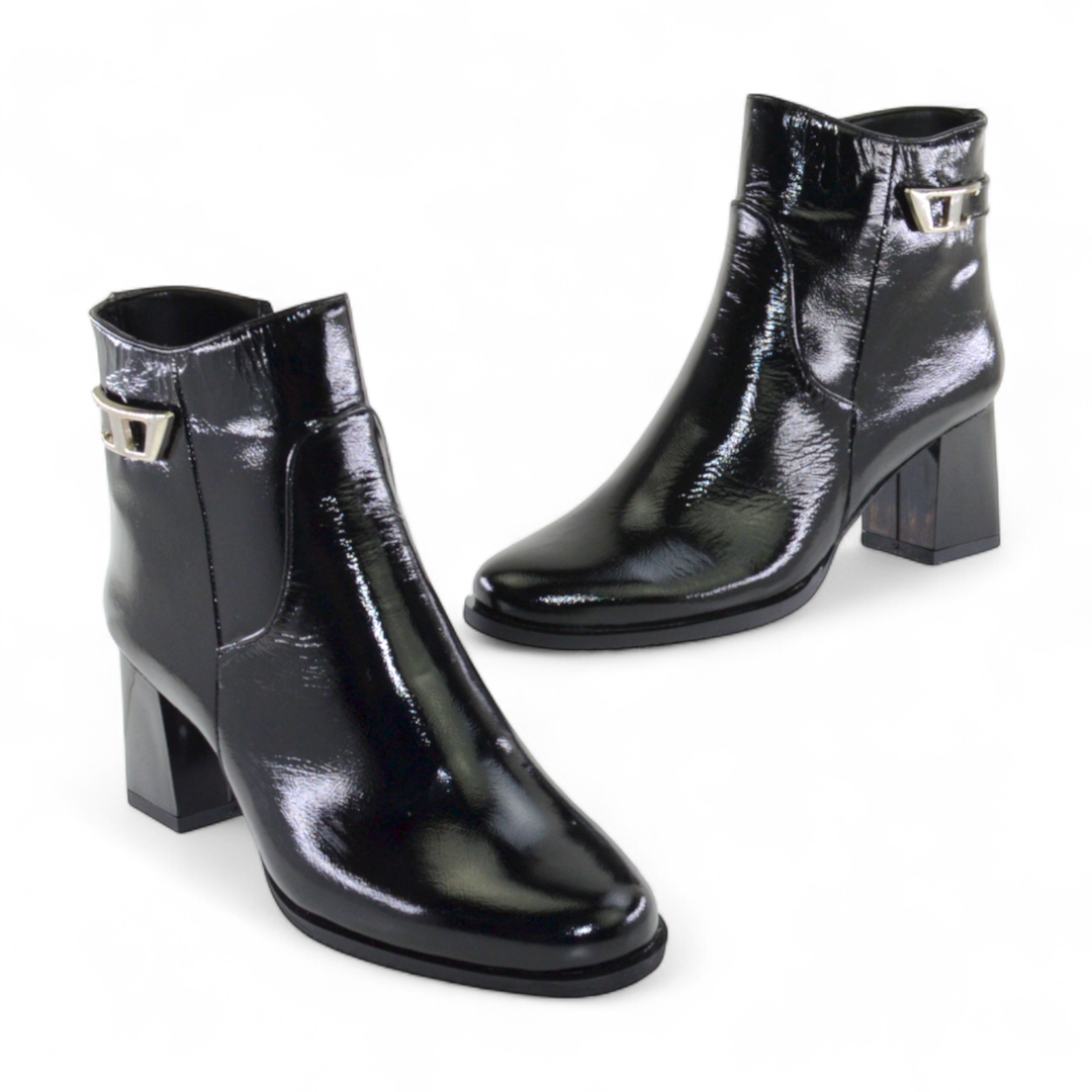 Ghete de dama piele negra cu curea si fermoar functional la inetrior Confectionate manual din piele naturala exterior Interior captusit cu blanita neagra Talpa groasa neagra. Brantul bocancilor este prevazut cu un buret special care ofera un plus de confort