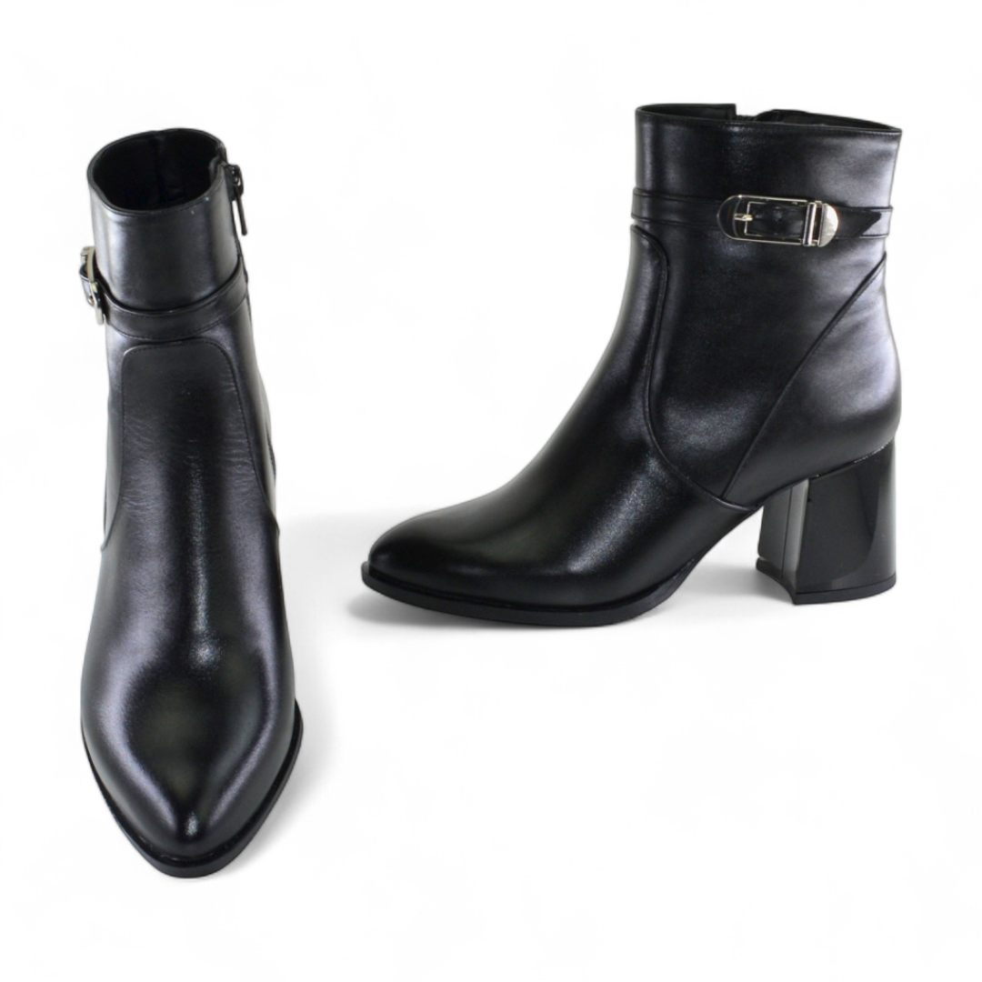 Ghete de dama piele negra cu curea si fermoar functional la inetrior Confectionate manual din piele naturala exterior Interior captusit cu blanita neagra Talpa groasa neagra. Brantul bocancilor este prevazut cu un buret special care ofera un plus de confort