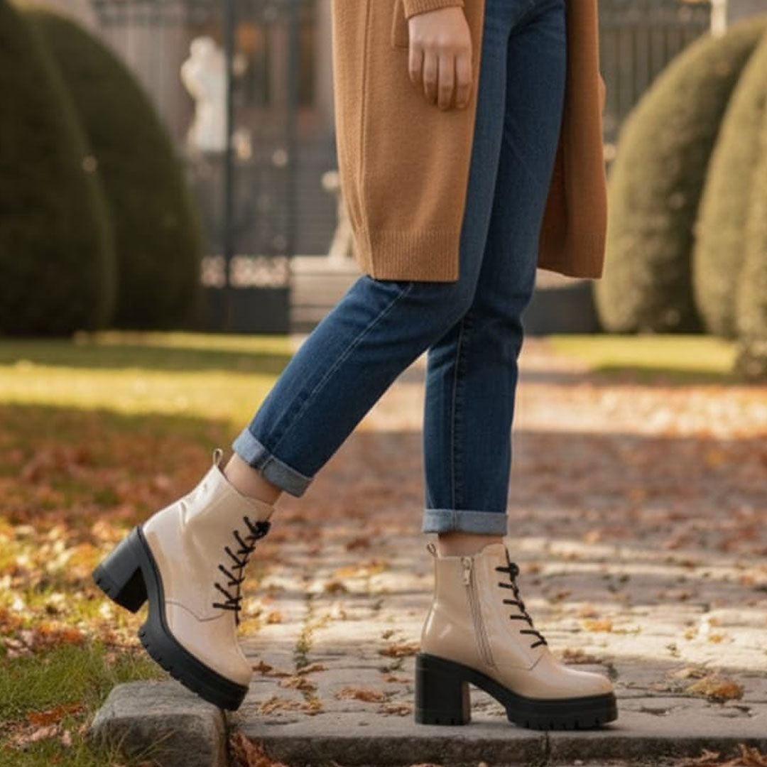 Bocanc piele naturala bej ,ideali pentru look-urile carora vrei sa le dai un twist rock si elegant in acelasi timp. - Bocanc cu siret si fermoar, inaltime gheata de la talpa in sus 17 cm - Talpa neagra - Interior brant cu burete special, la alegere: mesina naturala neagra si blanita neagra - Talpa inaltime 7.5 cm toc , Ghete produsi in Romania Producator: Nike Invest
