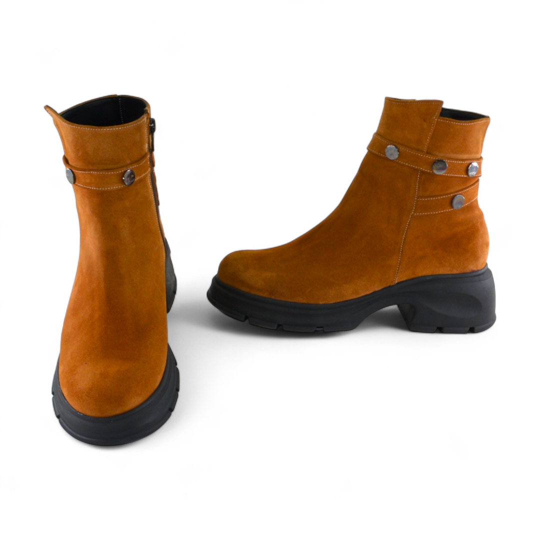 Ghete de dama piele orange velur cu fermoar si curea functional la inetrior Confectionate manual din piele naturala exterior Interior captusit cu blanita neagra Talpa groasa neagra. Brantul bocancilor este prevazut cu un buret special care ofera un plus de confort