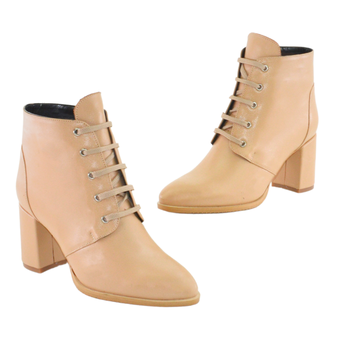 Botine elegante de dama cu toc vopsit. Confectionate manual din piele naturala exterior. Piele box bej. La interior sunt captusite cu blanita.  Brantul botinelor este prevazut cu un buret special care ofera un plus de comoditate. Botine produse in Romania.