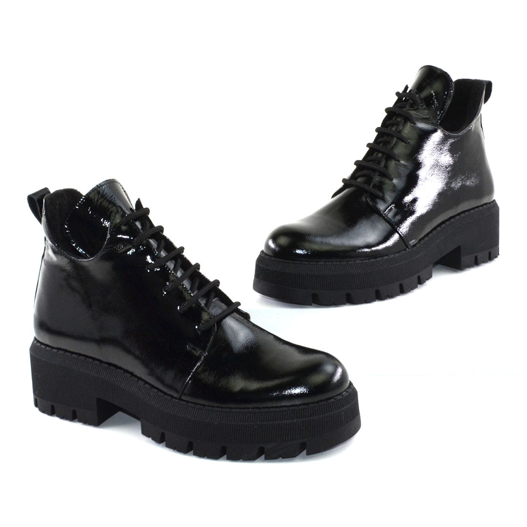 Ghete de dama piele naturala cu siret Confectionate manual din piele naturala negru lac Interior captusit cu blanita neagra Piele naturala: Talpa groasa neagra. Inaltime talpa in fata 3 cm, in spate 4 cm Brantul bocancilor este prevazut cu un buret special care ofera un plus de comoditate