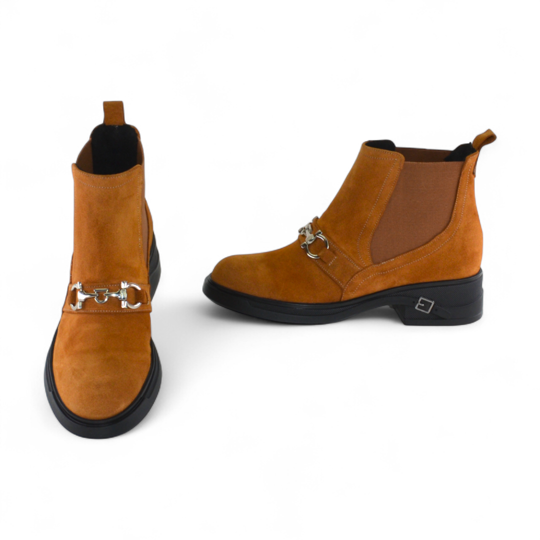 Ghete de dama piele naturala orange velur cu ornament cu elastic Confectionate manual din piele naturala capucino exterior Interior captusit cu blanita neagra Piele naturala: Talpa groasa neagra.  Brantul bocancilor este prevazut cu un buret special care ofera un plus de comoditate