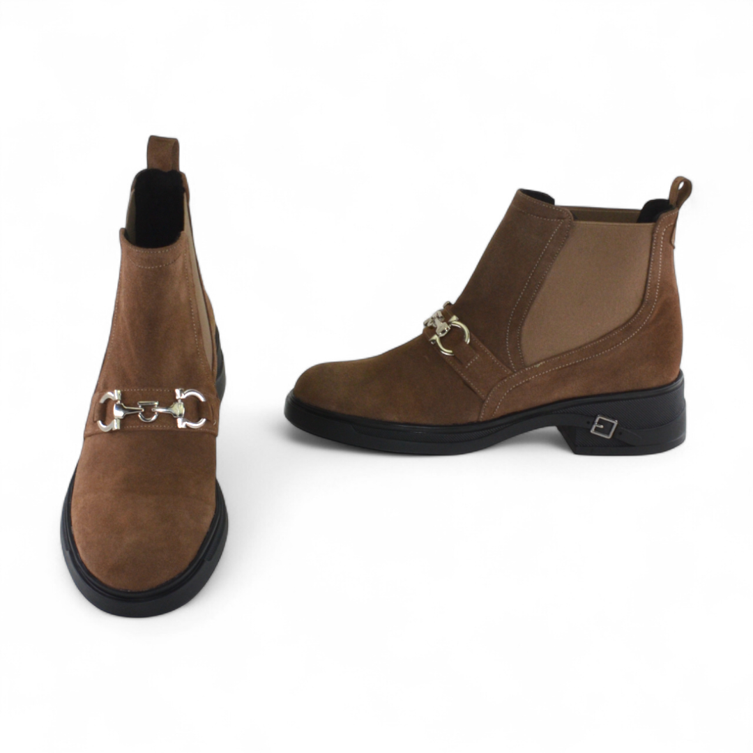 Ghete de dama piele naturala maro velur cu ornament cu elastic Confectionate manual din piele naturala capucino exterior Interior captusit cu blanita neagra Piele naturala: Talpa groasa neagra.  Brantul bocancilor este prevazut cu un buret special care ofera un plus de comoditate