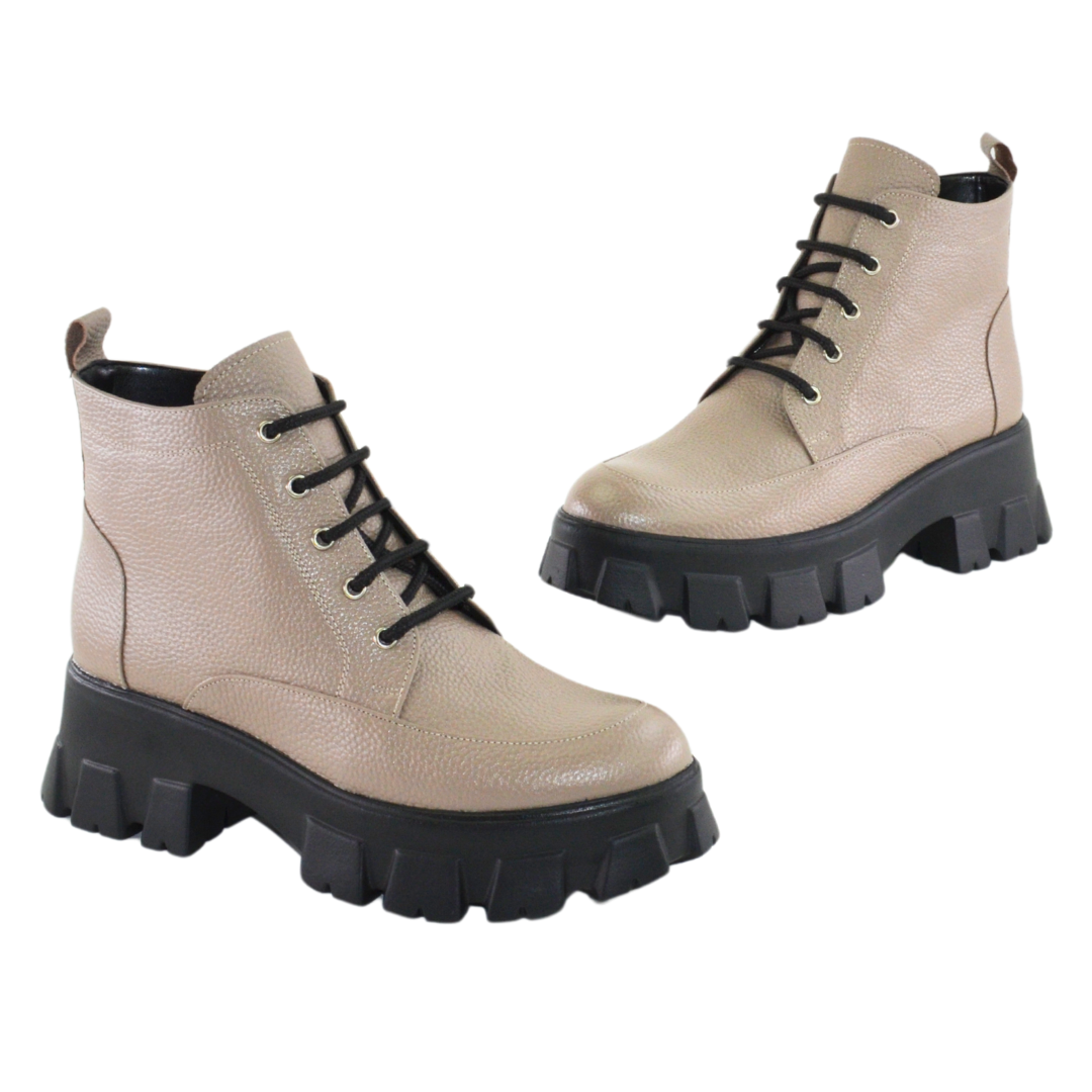 Ghete de dama piele natural. Confectionate manual din piele naturala exterior Interior captusit cu blanita neagra Piele naturala: bej. Talpa groasa neagra. Inaltime talpa in fata 3 cm, in spate 4.5 cm Brantul bocancilor este prevazut cu un buret special care ofera un plus de confort