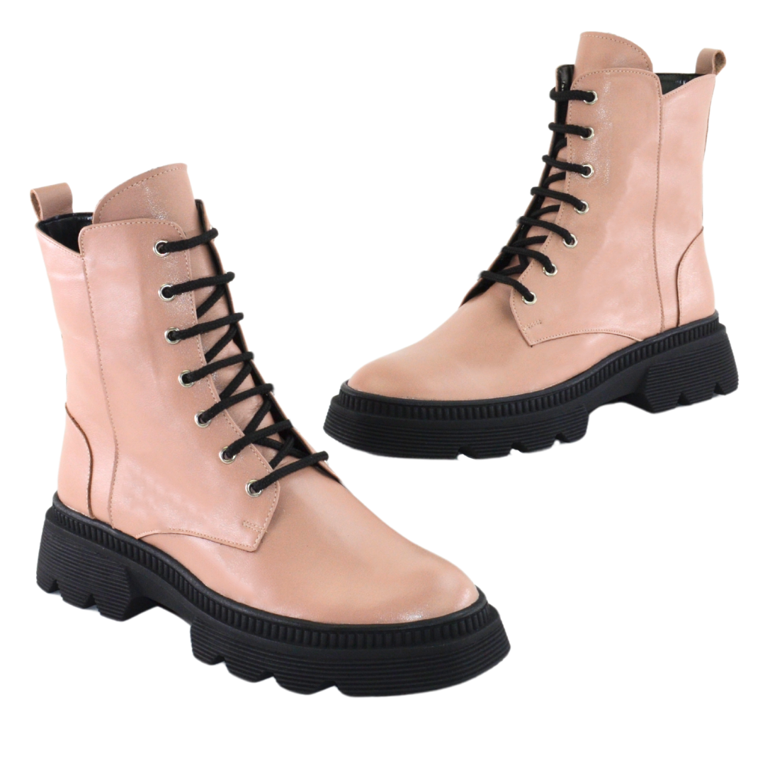Ghete de dama piele naturala cu siret si fermoar functional la inetrior Confectionate manual din piele naturala roz exterior Interior captusit cu blanita neagra Piele naturala: Talpa groasa neagra. Inaltime talpa in fata 3 cm, in spate 4 cm Brantul bocancilor este prevazut cu un buret special care ofera un plus de comoditate