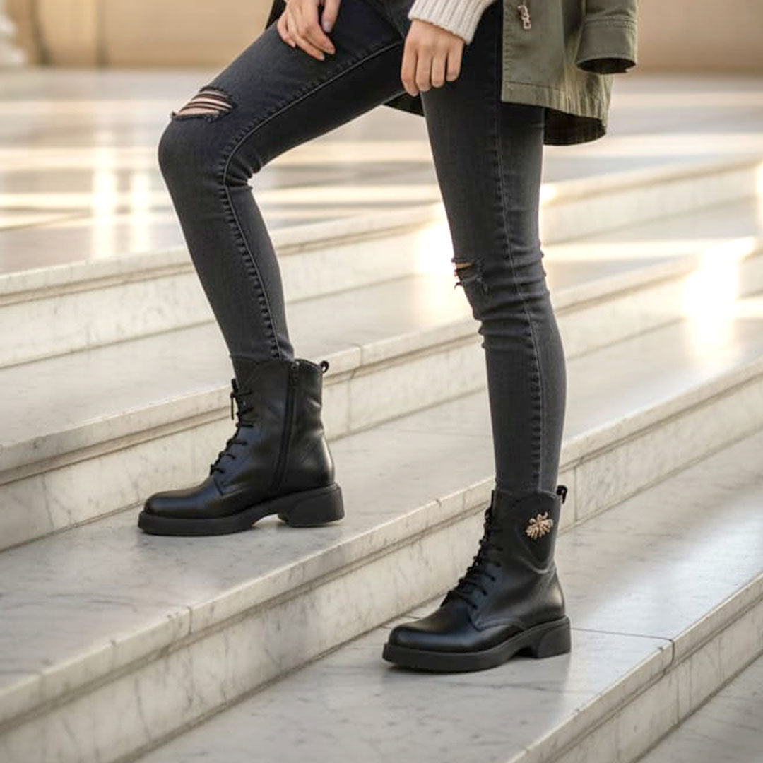 Ghete de dama piele naturala cu siret si fermoar functional la inetrior Confectionate manual din piele naturala neagra + piele neagra velur + ornament. Interior captusit cu blanita neagra Piele naturala: Talpa groasa neagra. Brantul bocancilor este prevazut cu un buret special care ofera un plus de comoditate