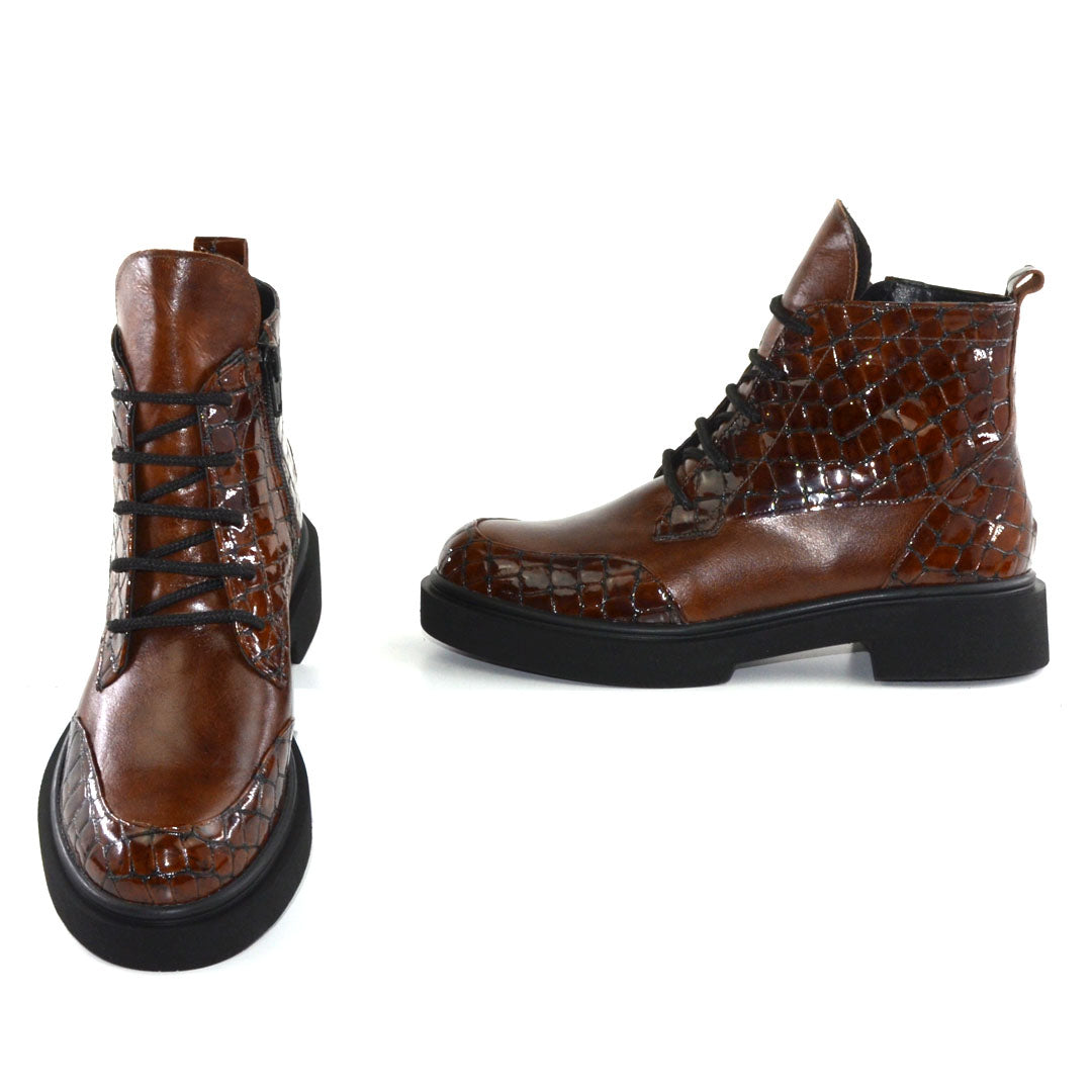 Ghete de dama piele naturala cu siret si fermoar functional la inetrior Confectionate manual din piele naturala exterior Interior captusit cu blanita neagra Piele naturala: maro croco + maro box . Talpa groasa neagra. Inaltime talpa in fata 2 cm, in spate 3.5 cm Brantul bocancilor este prevazut cu un buret special care ofera un plus de confort