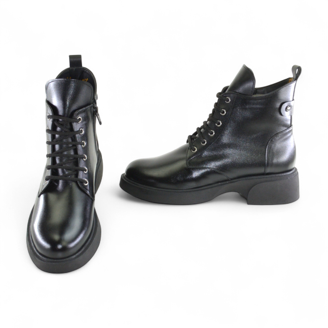 Ghete de dama piele negra cu siret si fermoar functional la inetrior Confectionate manual din piele naturala exterior Interior captusit cu blanita neagra Talpa groasa neagra. Brantul bocancilor este prevazut cu un buret special care ofera un plus de confort