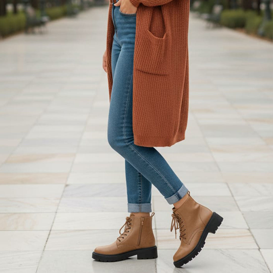 Ghete de dama piele naturala cappuccino cu siret si fermoar functional la inetrior Confectionate manual din piele naturala exterior Interior captusit cu blanita neagra Talpa groasa neagra. Brantul bocancilor este prevazut cu un buret special care ofera un plus de confort