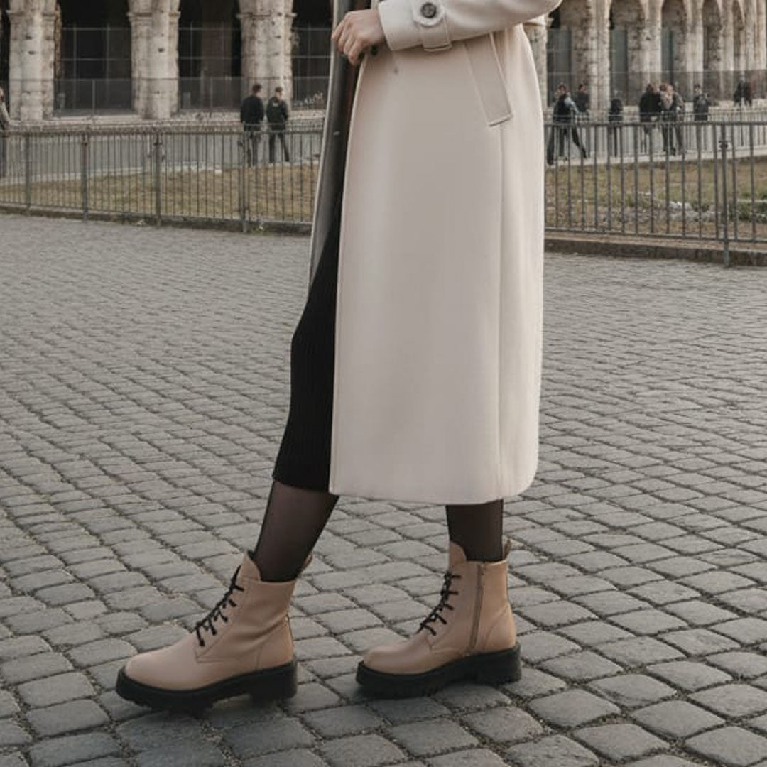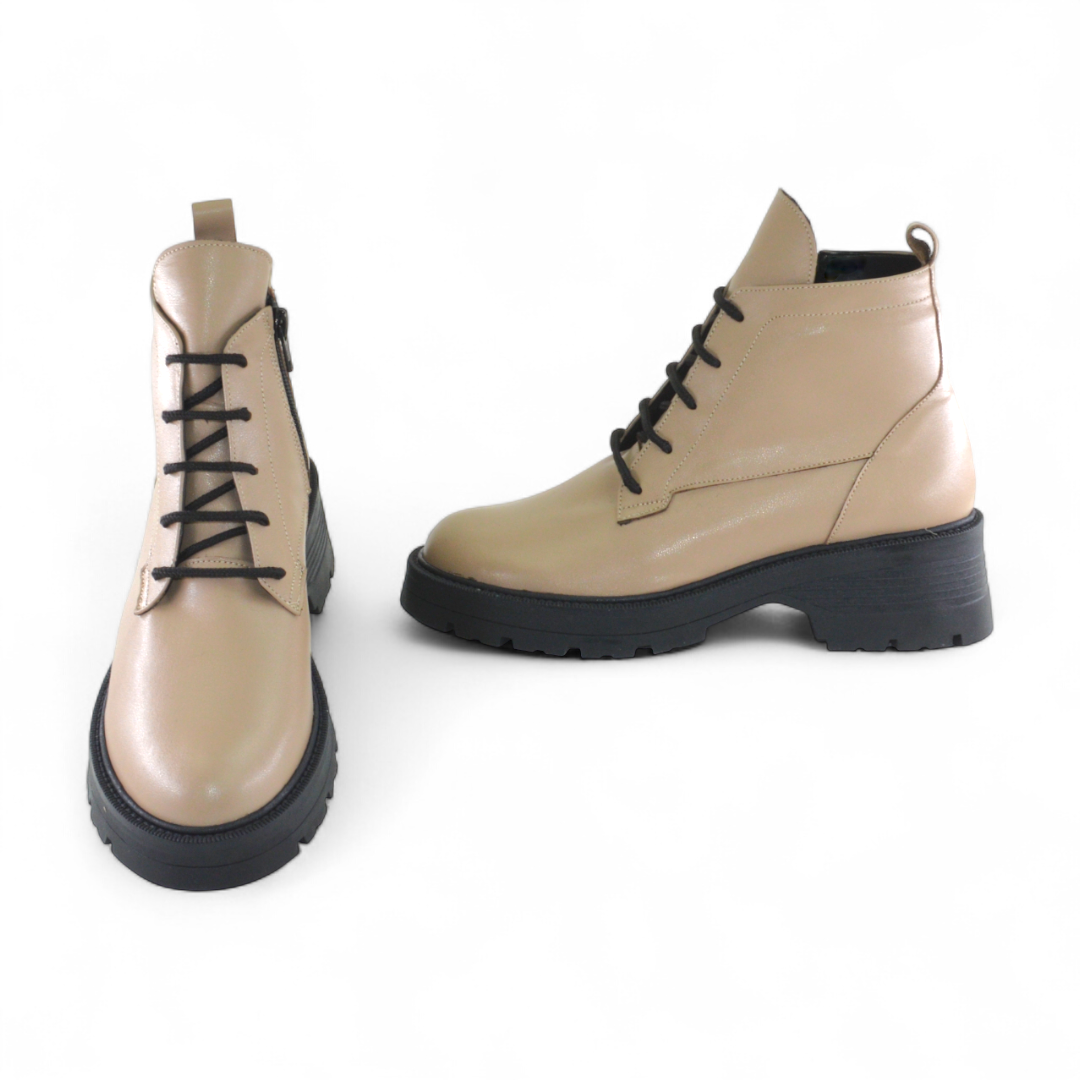 Ghete de dama piele bej cu siret si fermoar functional la inetrior Confectionate manual din piele naturala exterior Interior captusit cu blanita neagra Talpa groasa neagra. Brantul bocancilor este prevazut cu un buret special care ofera un plus de confort