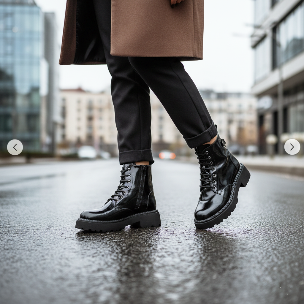 Ghete de dama piele negru cu siret si fermoar functional la inetrior Confectionate manual din piele naturala exterior Interior captusit cu blanita neagra Talpa groasa neagra. Brantul bocancilor este prevazut cu un buret special care ofera un plus de confort