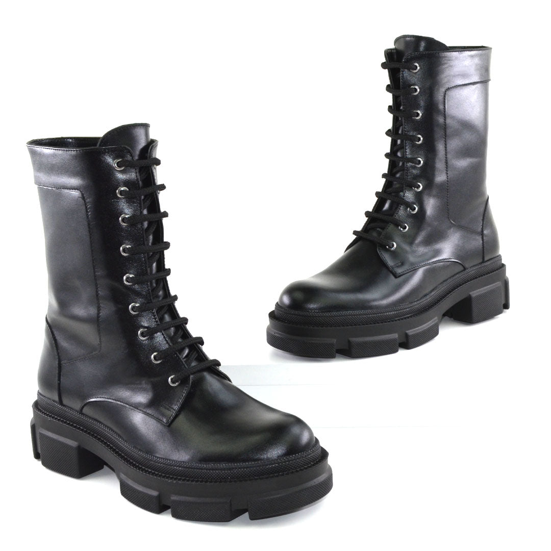 Ghete de dama piele naturala cu siret si fermoar functional la inetrior Confectionate manual din piele naturala exterior Interior captusit cu blanita neagra Piele naturala negru box . Talpa groasa neagra. Inaltime talpa in fata 3 cm, in spate 4.5 cm Brantul bocancilor este prevazut cu un buret special care ofera un plus de confort