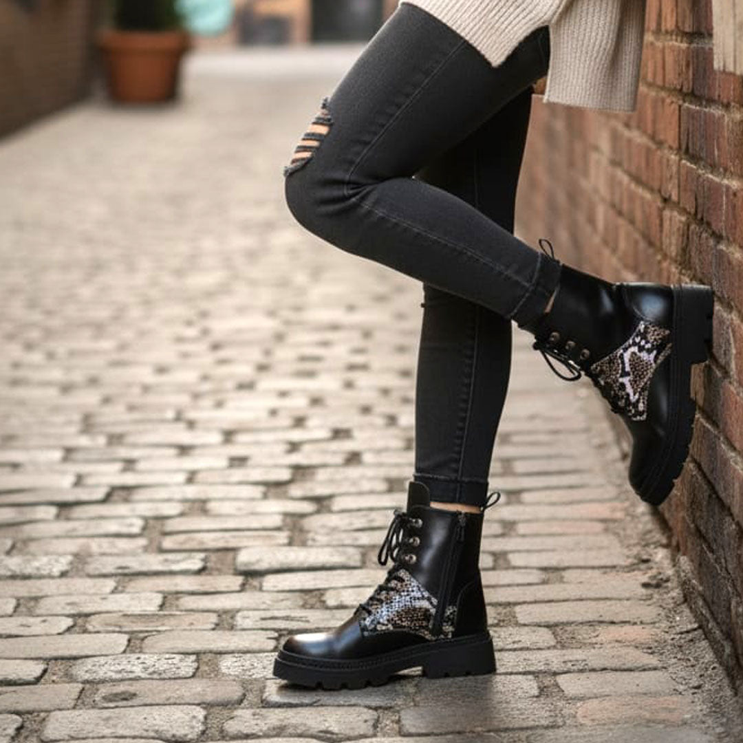 Ghete de dama piele negra si pile multicolor ,ghete cu siret si fermoar functional la inetrior Confectionate manual din piele naturala exterior Interior captusit cu blanita neagra Talpa groasa neagra. Brantul bocancilor este prevazut cu un buret special care ofera un plus de confort