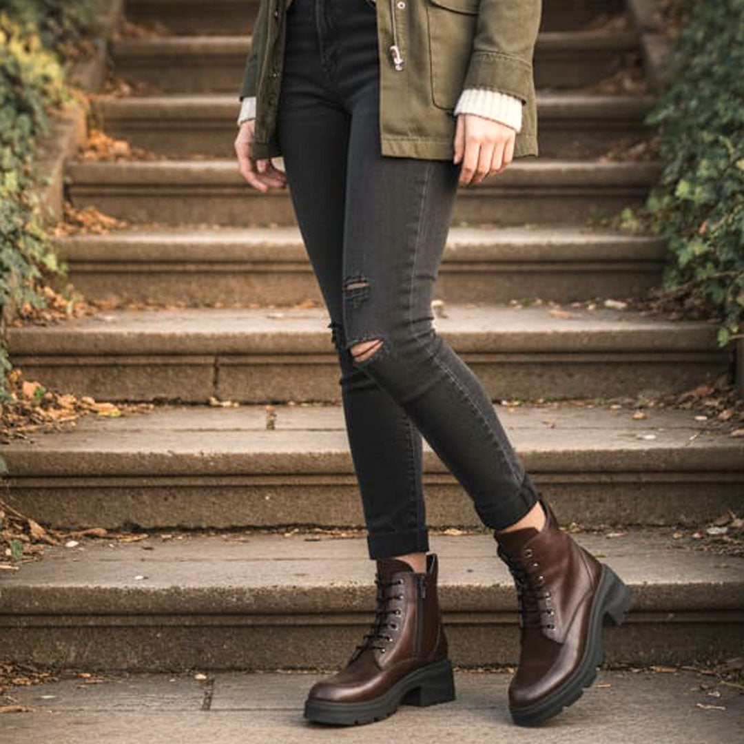 Ghete de dama piele naturala cu siret si fermoar functional la inetrior Confectionate manual din piele naturala maro exterior Interior captusit cu blanita neagra Piele naturala: Talpa groasa neagra. Brantul bocancilor este prevazut cu un buret special care ofera un plus de comoditate