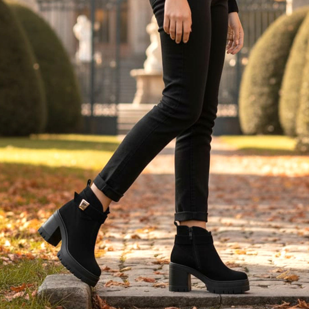 Ghete de dama piele negru velur cu fermoar si curea functional la inetrior Confectionate manual din piele naturala exterior Interior captusit cu blanita neagra Talpa groasa neagra. Brantul este prevazut cu un buret special care ofera un plus de confort