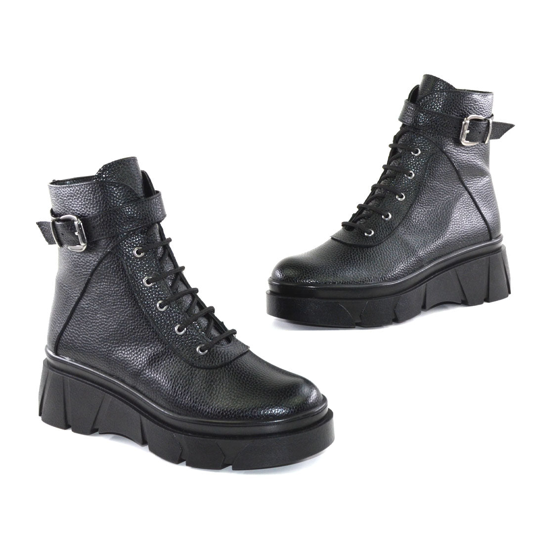 Ghete piele naturala negru bizonat , - Ghete: Material interior: captusite textil (blanita), - Talpa neagra cu platforma, varf rotunt, - Inaltime talpa: 4,5 cm in spate si 4 cm in fata, talpa usoara -Sistem inchidere - fermoar + siret