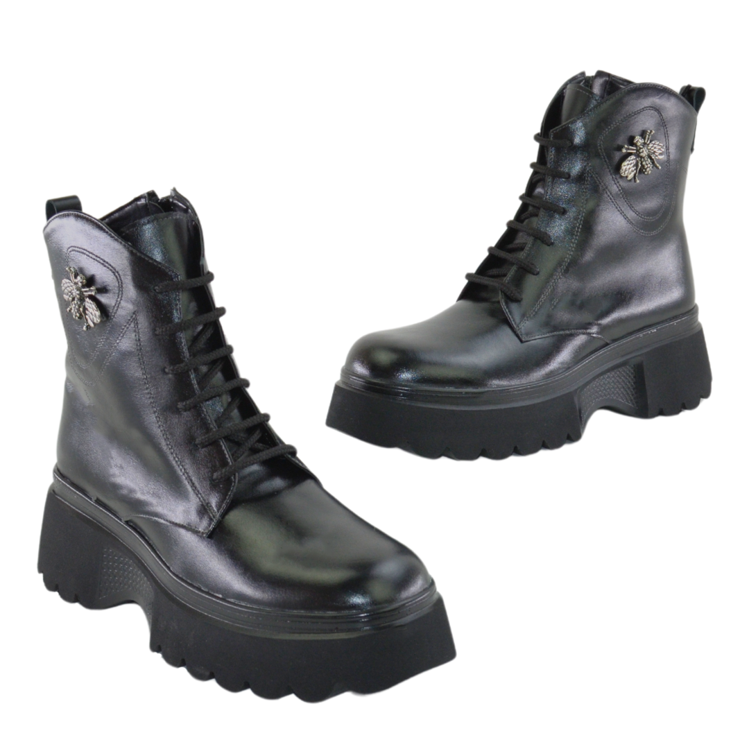 Ghete de dama piele negra cu ornament argintiu, siret si fermoar functional la inetrior Confectionate manual din piele naturala exterior Interior captusit cu blanita neagra Talpa groasa neagra. Brantul bocancilor este prevazut cu un buret special care ofera un plus de confort