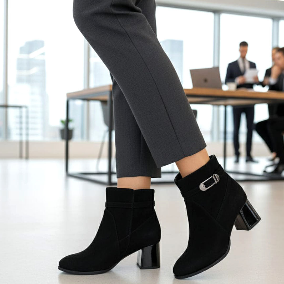 Ghete de dama piele negra cu curea si fermoar functional la inetrior Confectionate manual din piele naturala exterior Interior captusit cu blanita neagra Talpa groasa neagra. Brantul bocancilor este prevazut cu un buret special care ofera un plus de confort