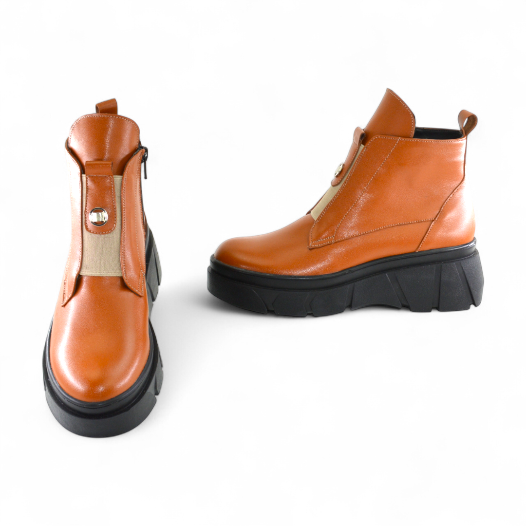 Ghete de dama piele naturala cu siret si fermoar functional la inetrior Confectionate manual din piele naturala orange cu ornament. exterior Interior captusit cu blanita neagra Piele naturala: Talpa groasa neagra. Brantul bocancilor este prevazut cu un buret special care ofera un plus de comoditate