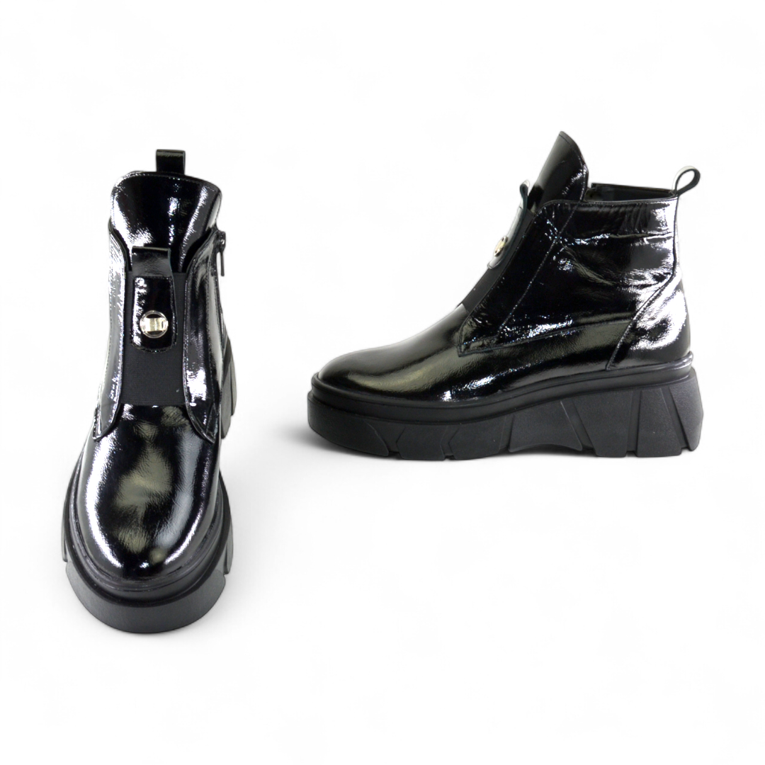 Ghete de dama piele naturala cu siret si fermoar functional la inetrior Confectionate manual din piele naturala neagra cu lac cu ornament. exterior Interior captusit cu blanita neagra Piele naturala: Talpa groasa neagra. Brantul bocancilor este prevazut cu un buret special care ofera un plus de comoditate