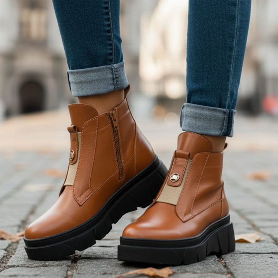 Ghete de dama piele naturala cu siret si fermoar functional la inetrior Confectionate manual din piele naturala orange cu ornament. exterior Interior captusit cu blanita neagra Piele naturala: Talpa groasa neagra. Brantul bocancilor este prevazut cu un buret special care ofera un plus de comoditate