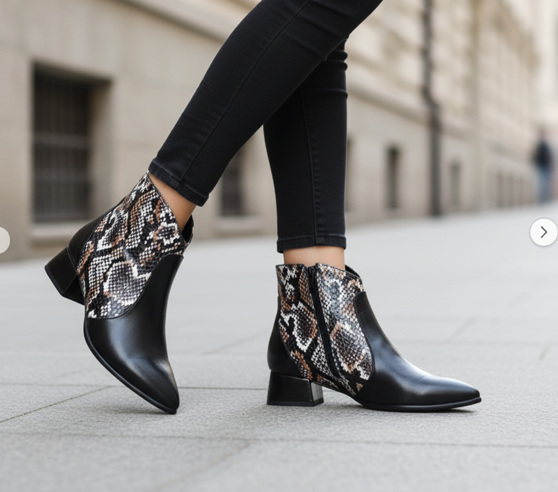 Botine elegante de dama cu toc vopsit Confectionate manual din piele naturala exterior Piele negra+croco. La interior sunt captusite cu blanita Inaltime toc 3,5 cm Toc imbracat piele cu insertie arginti Brantul botinelor este prevazut cu un buret special care ofera un plus de comoditate Botine produse in Romania