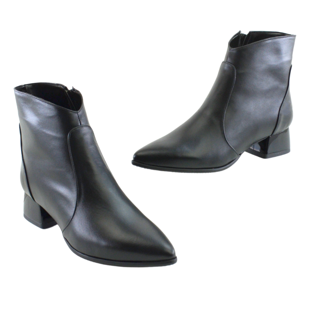 Botine elegante de dama cu toc vopsit Confectionate manual din piele naturala exterior Piele negru. La interior sunt captusite cu blanita Inaltime toc 3,5 cm Toc imbracat piele cu insertie arginti Brantul botinelor este prevazut cu un buret special care ofera un plus de comoditate Botine produse in Romania