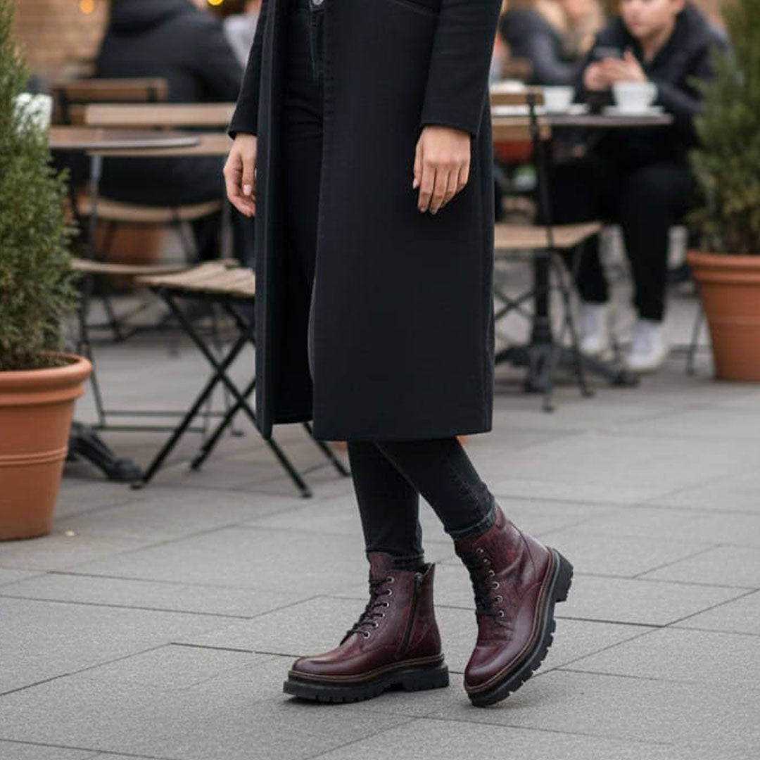 Ghete de dama piele grena cu piele grena gungi cu siret si fermoar functional la inetrior Confectionate manual din piele naturala exterior Interior captusit cu blanita neagra Talpa groasa neagra. Brantul bocancilor este prevazut cu un buret special care ofera un plus de confort