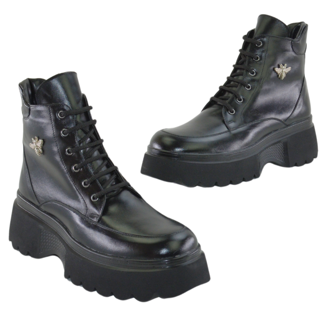 Ghete de dama piele negra cu ornament argintiu, siret si fermoar functional la inetrior Confectionate manual din piele naturala exterior Interior captusit cu blanita neagra Talpa groasa neagra. Brantul bocancilor este prevazut cu un buret special care ofera un plus de confort