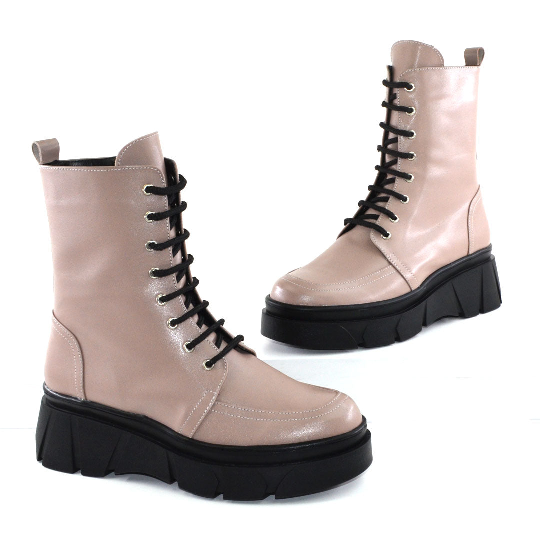 Ghete piele naturala bej cafe- Material interior: captusite textil (blanita), - Talpa neagra cu platforma, varf rotunt, - Inaltime talpa: 4,5 cm in spate si 4 cm in fata, talpa usoara -Sistem inchidere - fermoar + siret ,Ghete produsi in Romania Producator: Nike Invest