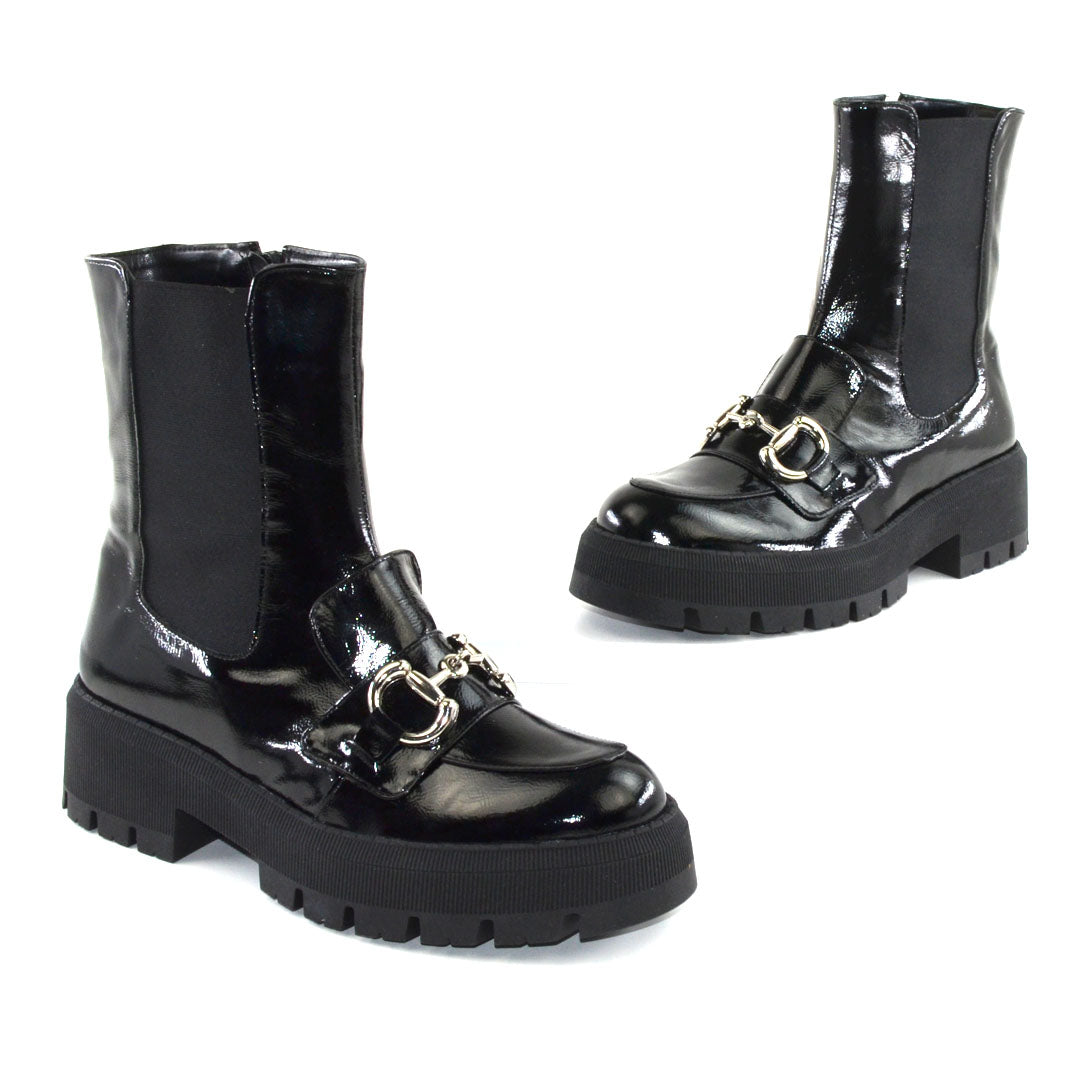 Ghete de dama piele naturala cu elastic si fermoar functional la inetrior Confectionate manual din piele naturala negru lacuita exterior Interior captusit cu blanita neagra Piele naturala: Talpa groasa neagra. Inaltime talpa in fata 3 cm, in spate 4 cm Brantul bocancilor este prevazut cu un buret special care ofera un plus de comoditate