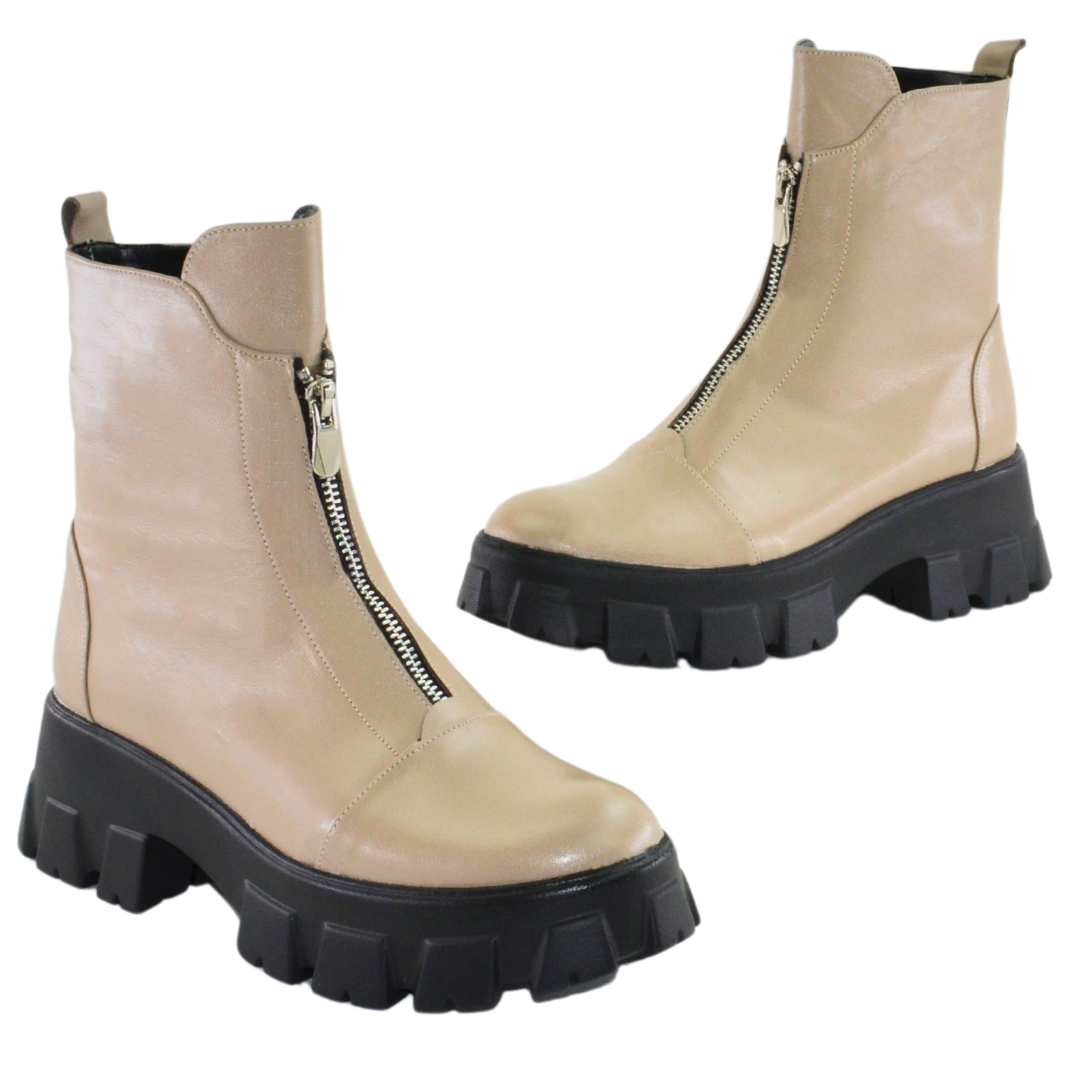 Ghete de dama piele naturala cu fermoar functional. Confectionate manual din piele naturala bej exterior Interior captusit cu blanita neagra Piele naturala: Talpa groasa neagra.  Brantul bocancilor este prevazut cu un buret special care ofera un plus de comoditate