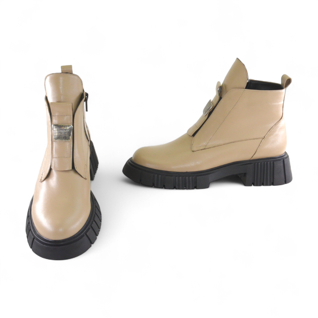 Ghete de dama piele bej + ornament argintiu cu siret si fermoar functional la inetrior Confectionate manual din piele naturala exterior Interior captusit cu blanita neagra Talpa groasa neagra. Brantul bocancilor este prevazut cu un buret special care ofera un plus de confort
