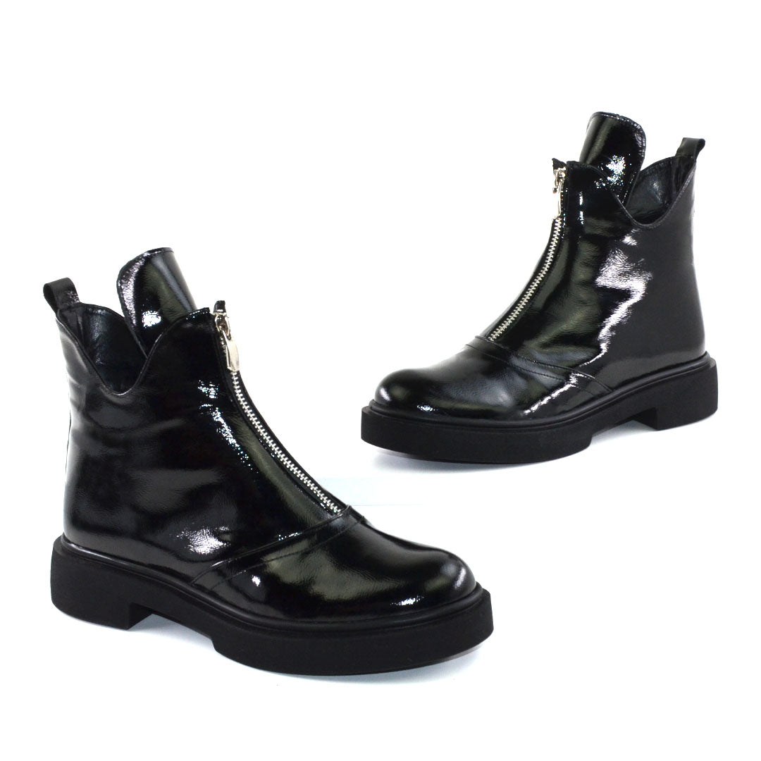 Ghete piele naturala lac negru , - Ghete: Material interior: captusite textil (blanita), - Talpa neagra, varf rotunt, - Inaltime talpa: 3,5 cm in spate si 2,5 cm in fata, talpa usoara -Sistem inchidere - fermoar ,Ghete produsi in Romania Producator: Nike Invest
