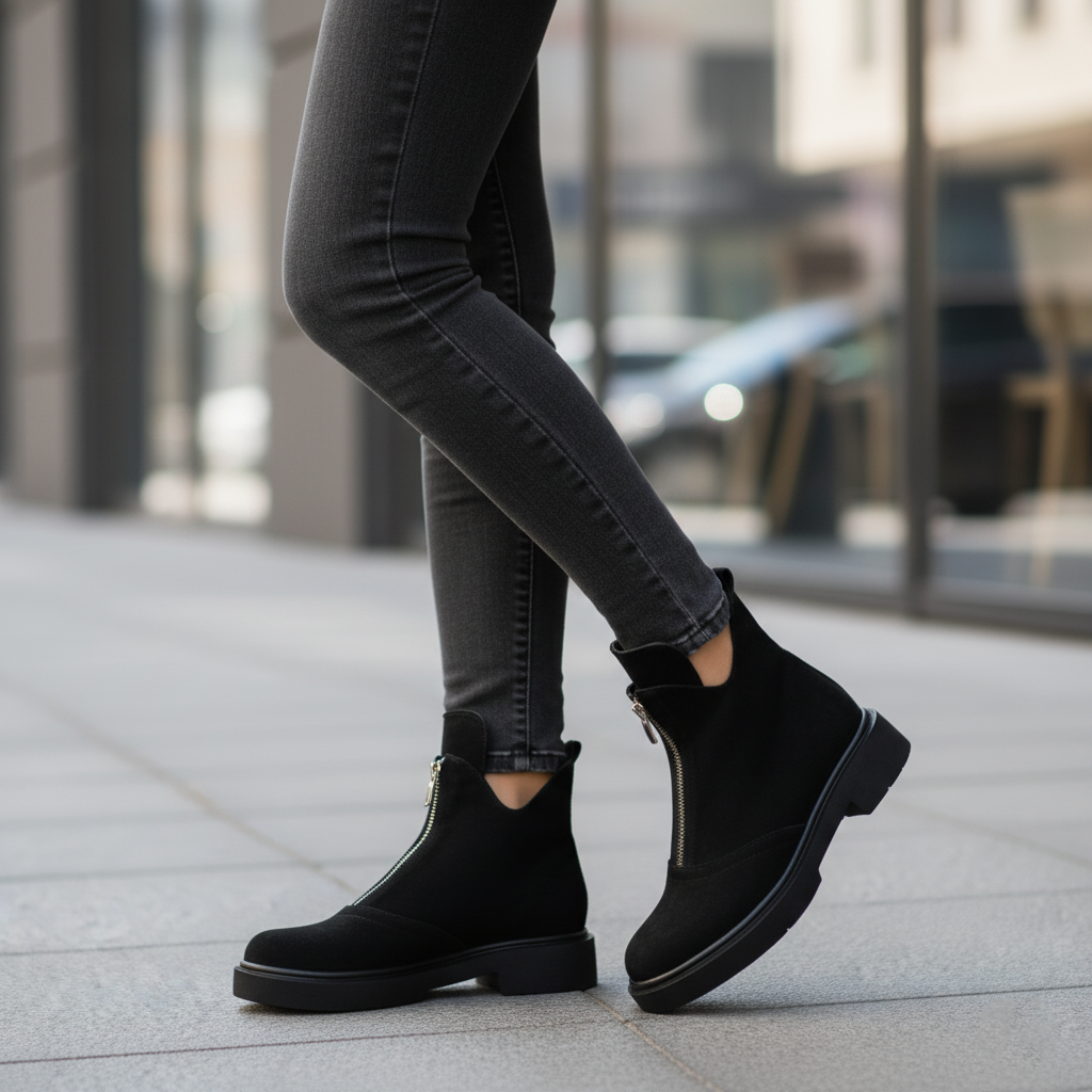 Ghete piele naturala negru velur , - Ghete: Material interior: captusite textil (blanita), - Talpa neagra, varf rotunt, - Inaltime talpa: 3,5 cm in spate si 2,5 cm in fata, talpa usoara -Sistem inchidere - fermoar ,Ghete produsi in Romania Producator: Nike Invest