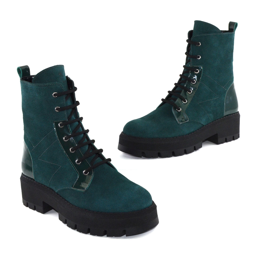 Ghete de dama piele naturala cu siret si fermoar functional la inetrior Confectionate manual din piele naturala velur verde si piele lacuita exterior Interior captusit cu blanita neagra Piele naturala: Talpa groasa neagra. Inaltime talpa in fata 3 cm, in spate 4 cm Brantul bocancilor este prevazut cu un buret special care ofera un plus de comoditate