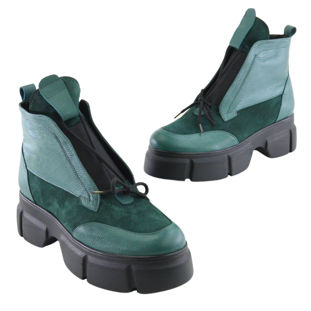 Ghete de dama piele naturala cu elastic si fermoar functional la inetrior Confectionate manual din piele naturala exterior Interior captusit cu blanita neagra Piele naturala: verde+ velur verde. Talpa groasa neagra. Inaltime talpa in fata 3,5 cm, in spate 4.5 cm Brantul bocancilor este prevazut cu un buret special care ofera un plus de confort