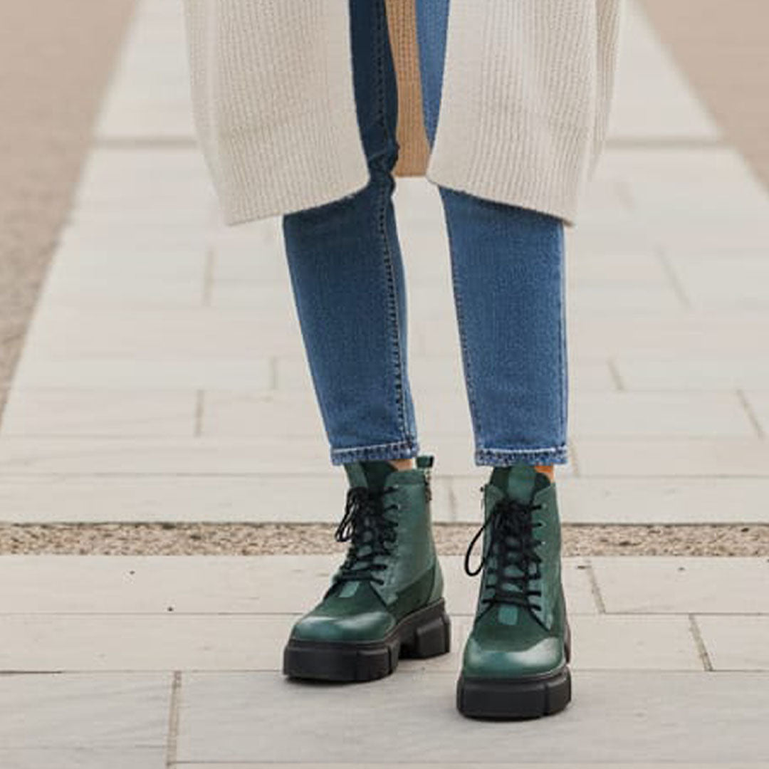 Ghete de dama piele naturala cu elastic si fermoar functional la inetrior Confectionate manual din piele naturala exterior Interior captusit cu blanita neagra Piele naturala: verde+ velur verde. Talpa groasa neagra. Inaltime talpa in fata 3,5 cm, in spate 4.5 cm Brantul bocancilor este prevazut cu un buret special care ofera un plus de confort