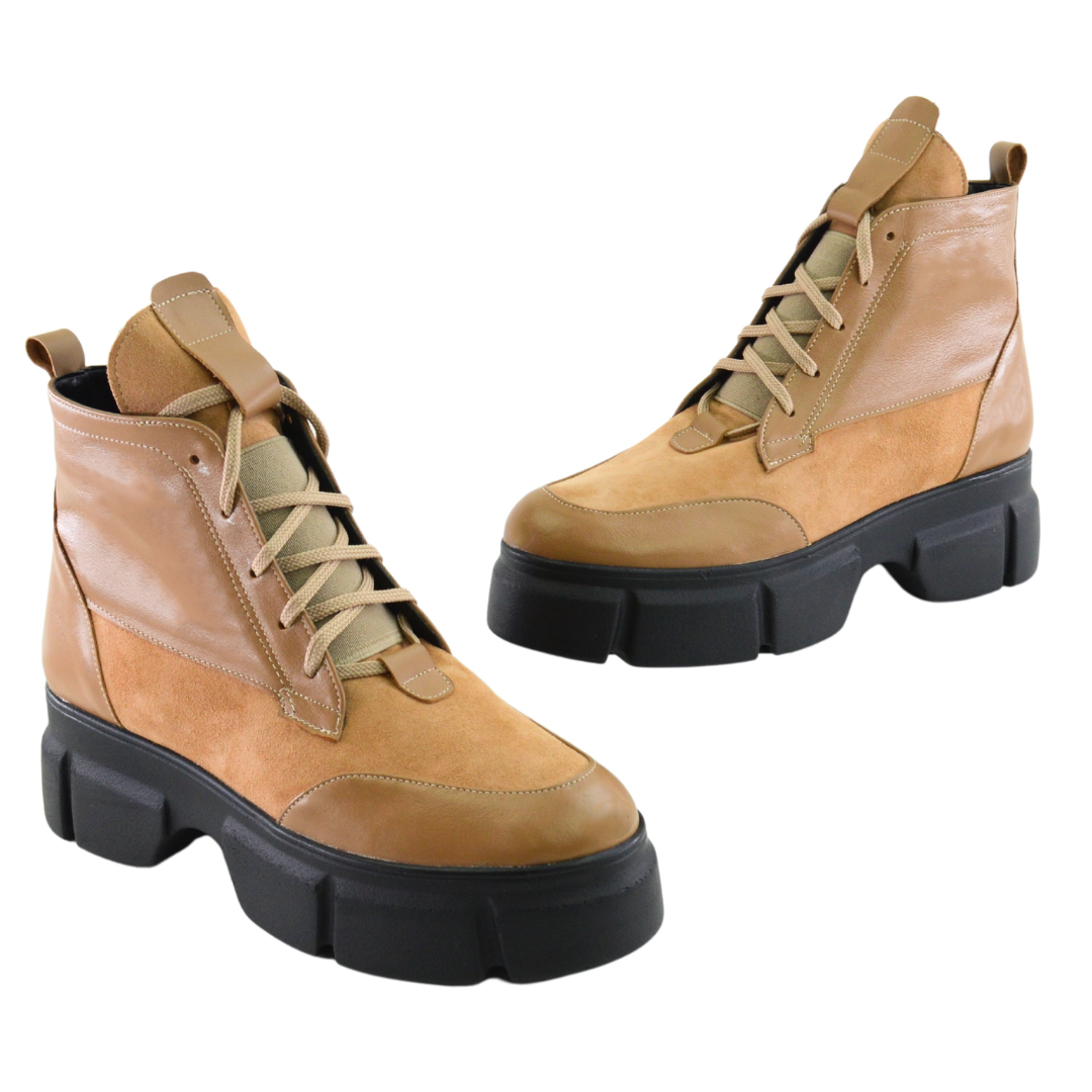 Ghete de dama piele naturala cu elastic si fermoar functional la inetrior Confectionate manual din piele naturala exterior Interior captusit cu blanita neagra Piele naturala: bej + velur bej . Talpa groasa neagra. Inaltime talpa in fata 3,5 cm, in spate 4.5 cm Brantul bocancilor este prevazut cu un buret special care ofera un plus de confort
