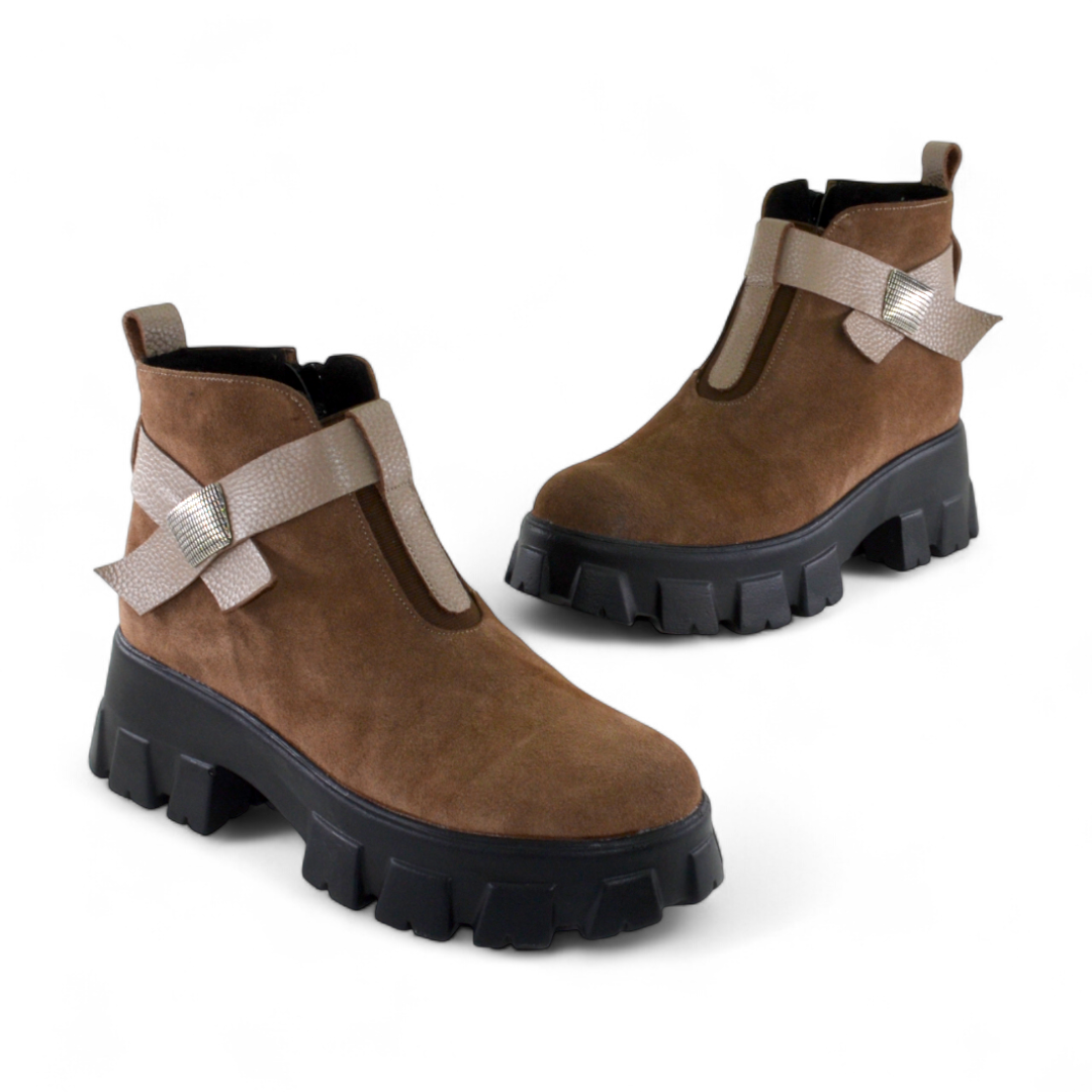 Ghete de dama piele naturala maro velur cu ornament cu elastic Confectionate manual din piele naturala capucino exterior Interior captusit cu blanita neagra Piele naturala: Talpa groasa neagra. Brantul bocancilor este prevazut cu un buret special care ofera un plus de comoditate