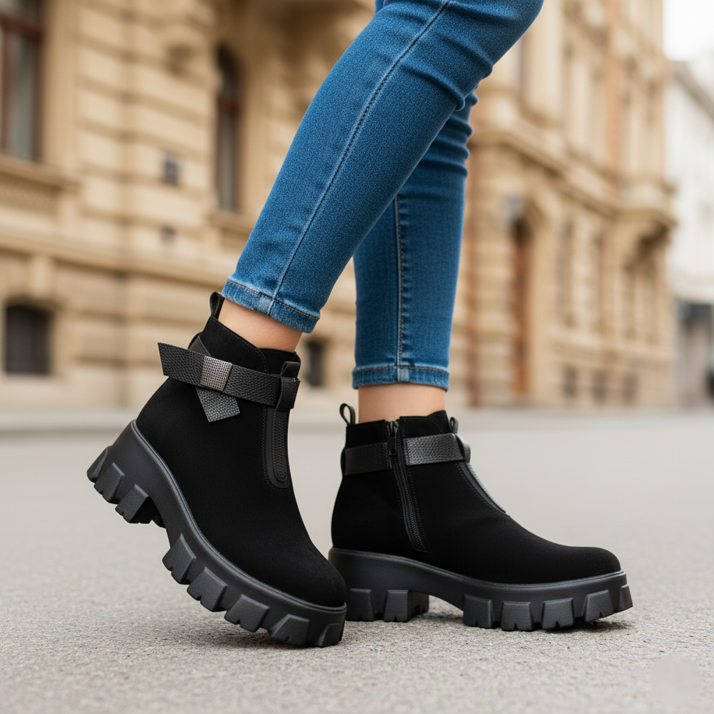 Ghete de dama piele neagru velur cu fermoar si curea functional la inetrior Confectionate manual din piele naturala exterior Interior captusit cu blanita neagra Talpa groasa neagra. Brantul bocancilor este prevazut cu un buret special care ofera un plus de confort