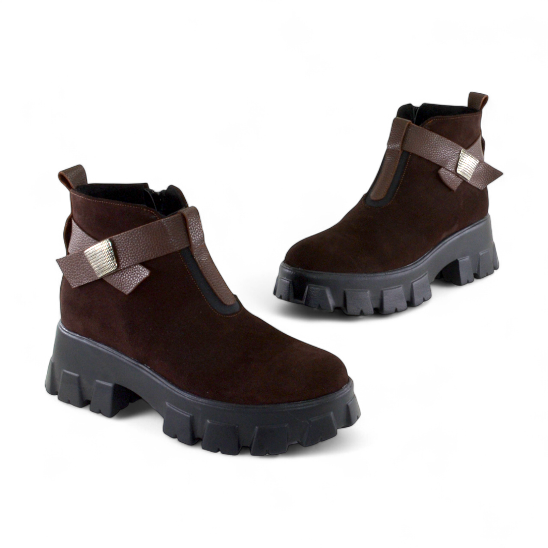 Ghete de dama piele maro velur cu fermoar si curea functional la inetrior Confectionate manual din piele naturala exterior Interior captusit cu blanita neagra Talpa groasa neagra. Brantul bocancilor este prevazut cu un buret special care ofera un plus de confort