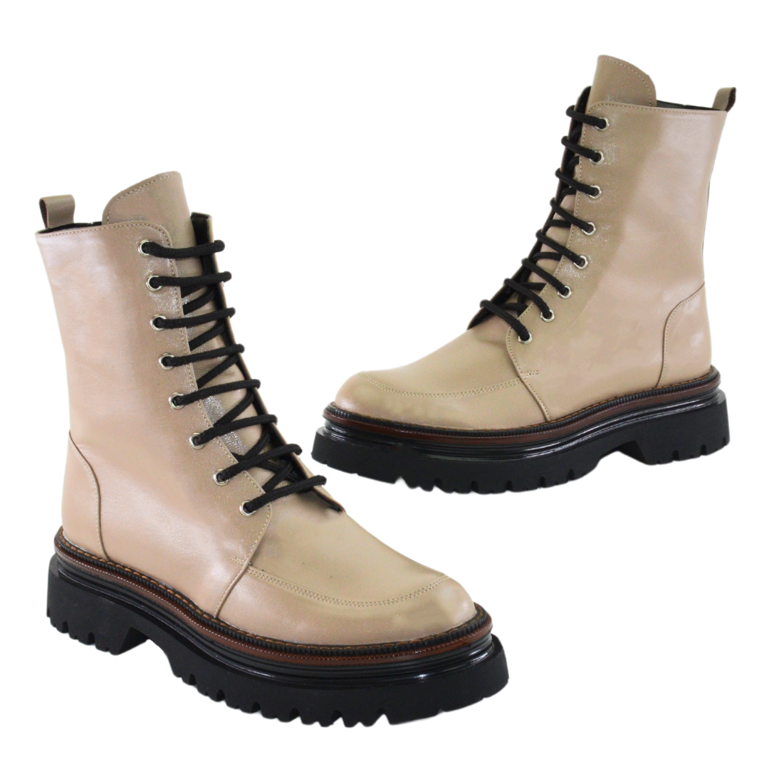 Ghete de dama piele naturala cu siret si fermoar functional la inetrior Confectionate manual din piele naturala bej exterior Interior captusit cu blanita neagra Piele naturala: Talpa groasa neagra. Inaltime talpa in fata 3 cm, in spate 4 cm Brantul bocancilor este prevazut cu un buret special care ofera un plus de comoditate