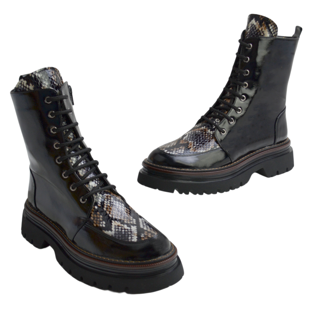 Ghete de dama piele naturala cu siret si fermoar functional la inetrior Confectionate manual din piele naturala negru exterior Interior captusit cu blanita neagra Piele naturala: Talpa groasa neagra. Inaltime talpa in fata 3 cm, in spate 4 cm Brantul bocancilor este prevazut cu un buret special care ofera un plus de comoditate